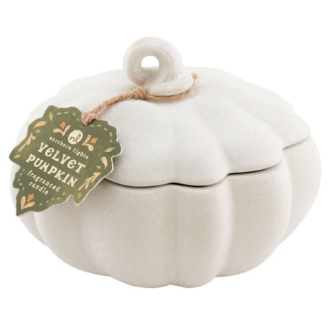 Handcrafted ceramic design featuring a carved stem handle and organic gourd shape in two autumnal colors. A fragrance reminiscent of golden afternoons, each pumpkin is the perfect addition to fall festivities.